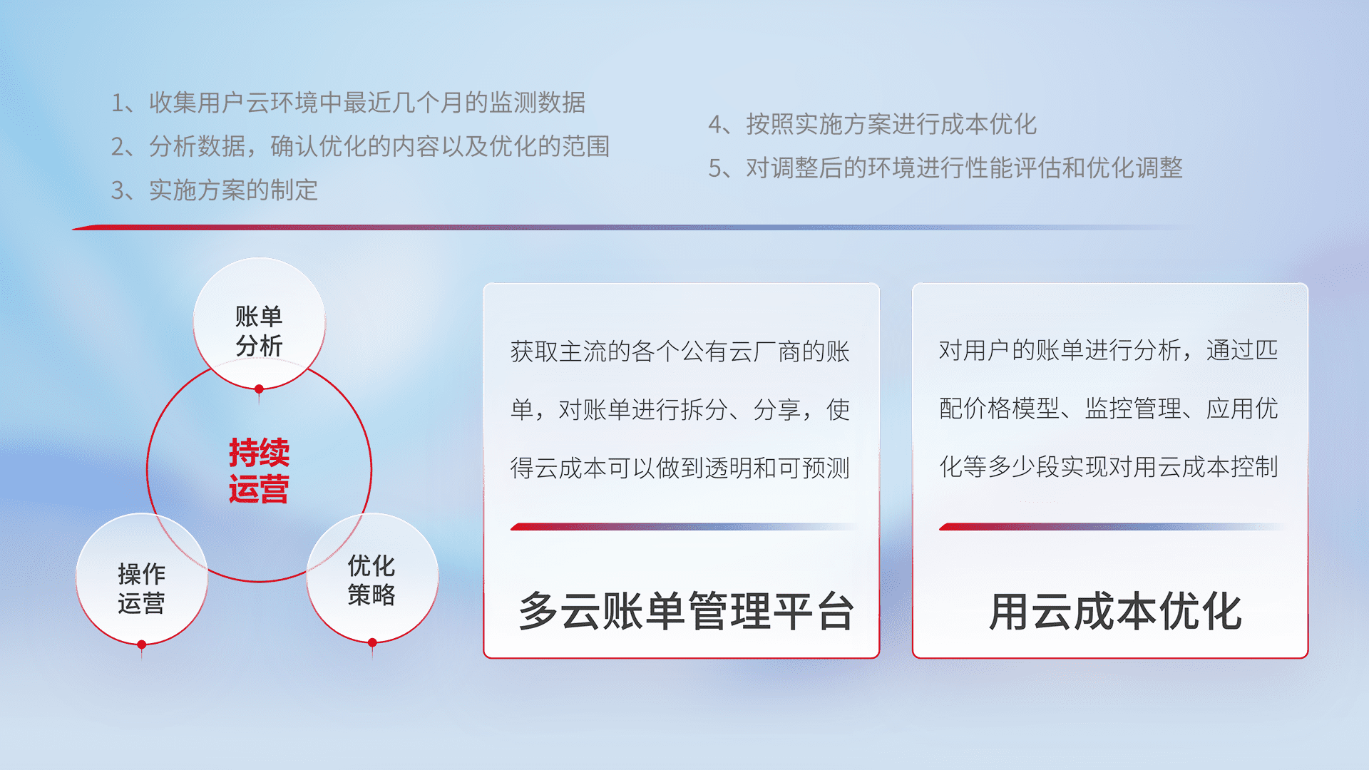通过多云纳管,,以统一的资源数据模型把客户的云资源进行抽象和封装,,,,进而实现对多云资源的统一操作,,,保障云资源管理的可靠性、、、稳定性与可用性。。。量身定制化运维内容,,,,配置、、开发运维、、补丁管理、、备份、、、监控、、认证和访问管理、、、、审计和日常巡检等,,保障在用云过程中的可靠度,,,稳定度以及高可用率。。。